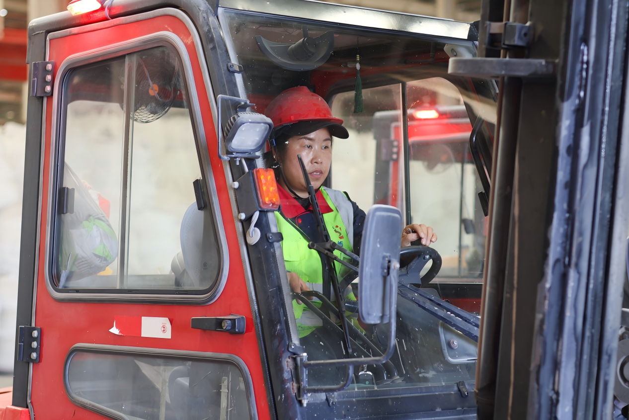 在紧张繁忙的氧化铝卸货现场,在重重堆叠的集装箱之间,活跃着一道格外亮眼的风景线——那是一支由女性组成的叉车作业组。她们头戴明红色安全帽,身着鲜亮的劳保服,双手稳稳握住方向盘,目光坚定,动作娴熟,那神态、那技术,一点不输男性司机。她们在集装箱与氧化铝原料堆之间灵活穿梭,精准的操作、稳定的效率,用实力证明了“谁说女子不如男,女人能顶半边天”的正确性。
